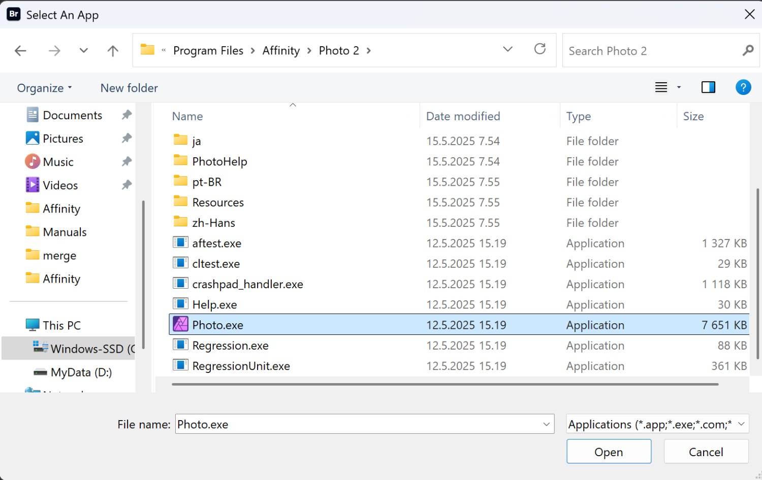 Click the Browse button within Bridge (see screenshot above), and then point to the Photo.exe, which you should have installed here: ...in case you have installed the app by using MSI installer. If you instead have installed as an app (using MSIX installer), then the executable is hidden under C:\Program Files\WindowsApps, which you cannot directly access. In this case you might have desktop shortcut (a .lnk file) created that points to Photo, and you could instead select this .lnk file when browsing for the associated app within Bridge. Or, you could alternatively choose to uninstall Affinity apps and download the MSI setup package so that you can install the Affinity suite as traditional Windows applications.