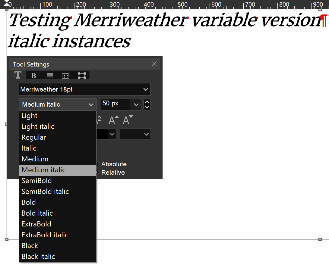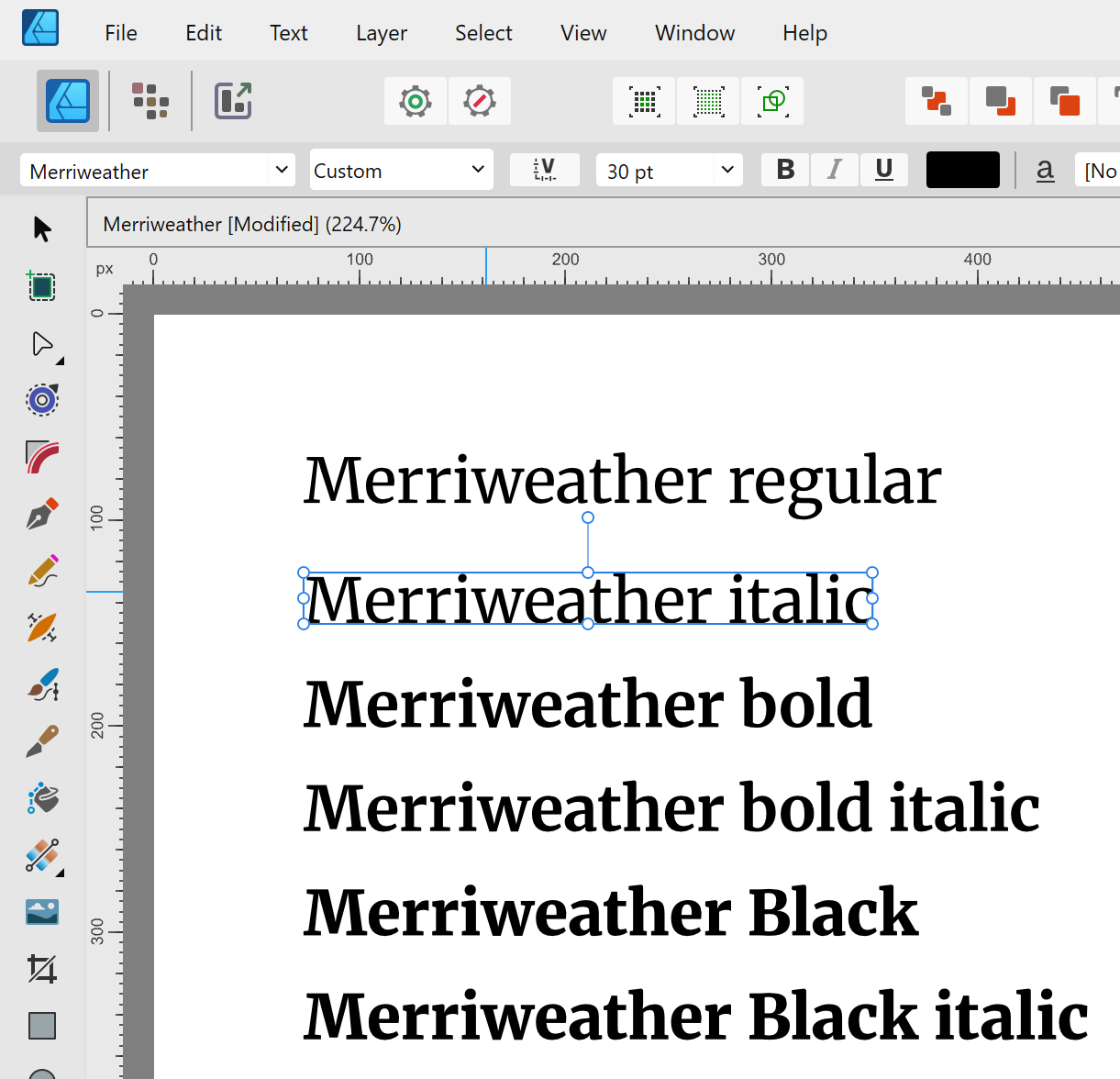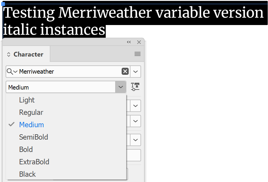 This is quite interesting, as it seems that encoding italics variable instances can be done in multiple ways, but not all apps support the way it is done in Merriweather. In addition to Affinity apps, current Adobe CC2025 apps and CorelDRAW fail to recognize them (at least on Windows), but e.g. PhotoLine shows them without issues: InDesign CC2025: PhotoLine: On the other hand, all the mentioned apps show without problems the italic instances of e.g. the variable font Cascadia Code.