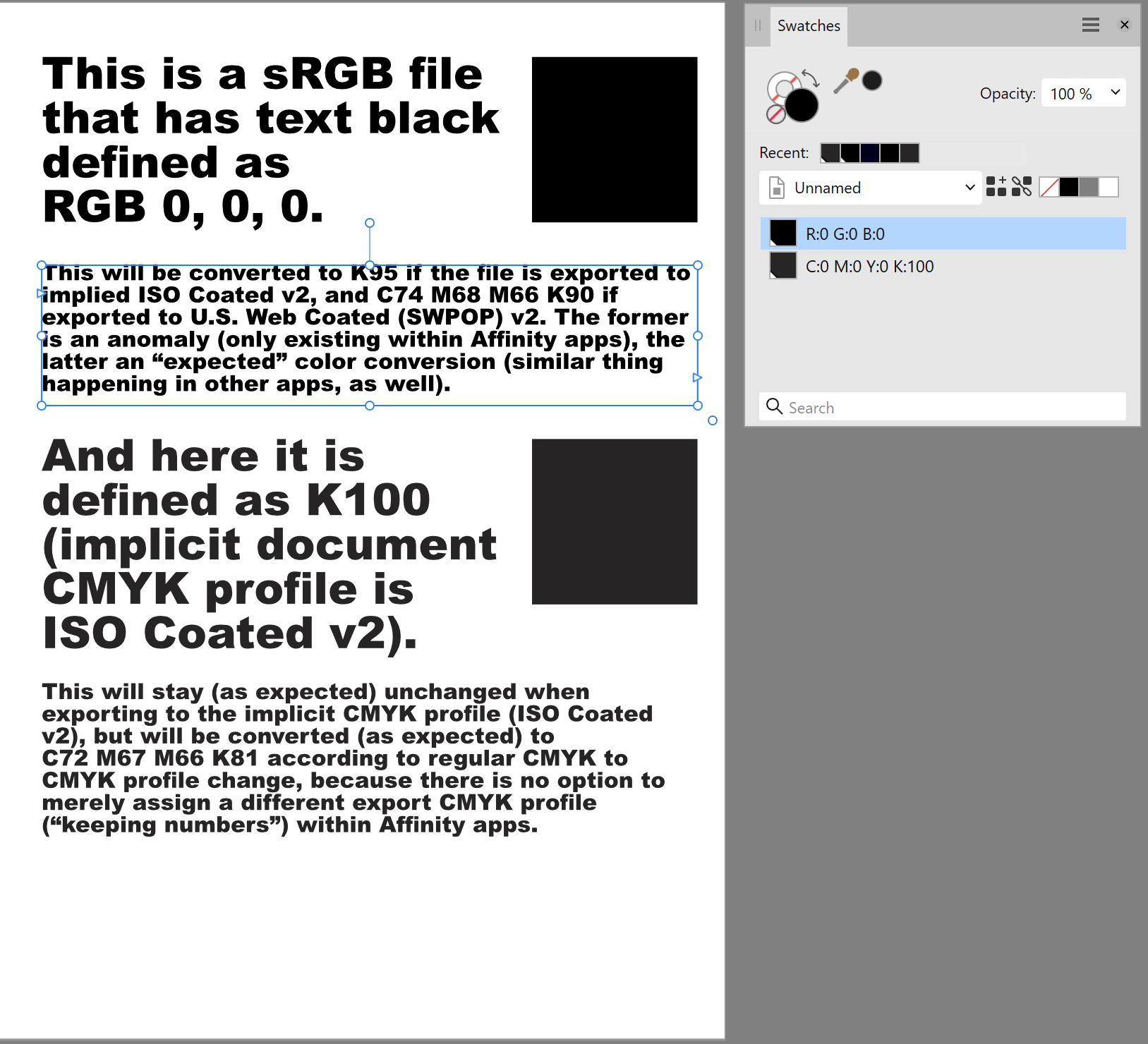 I might have misunderstood what is implied here, but in my experience defining text or object color value using an RGB definition (any value, including 0, 0, 0), will always be translated whenever converting to CMYK at export time. This happens in all press-related apps that I have experience of, even if Affinity apps do behave in a bit peculiar way in certain situations (see e.g. the attached file, using sRGB color space and implied ISO Coated v2 CMYK document color profile, where an RGB black will be converted to K95, instead of rich black, as would be expected): affinityblacks.afpub Because of this, the "correct" ("controlled") method of doing these kinds of conversions would be doing it by using File > Document Setup > Color, and then using the "Convert" option and selecting a new CMYK target profile for the document (it is generally recommendable to have the document initially in CMYK color mode whenever targeting to CMYK; placed images, however, should generally be in RGB color space). For insignificant profile changes, using the "Assign" option would be a better choice, to avoid (unnecessary) change of current CMYK definitions. Note that when converting, the color values of objects that have been applied by using CMYK based swatch assignments will be implicitly translated (even if assigned colors still typically appear to be unchanged), so the swatch definitions are not converted even if the assignments are seemingly retained (but actually lost; keeping the assignments with changed swatch definitions would make it possible to change the converted values back to K100 simply by adjusting the swatch definitions, but this is not a usable method within Affinity apps). This means that the blacks need to be anchored to K100 either by using a text style definition, as advised above, or by using the "select same color" method, and then (re-applying the desired (original and unchanged) swatch value. It may be worth a note, too, that there is no equivalent within Affinity apps to a CMYK based swatch value [Black] that is used in Adobe InDesign, which causes that objects that have been assigned with [Black], will be exported as K100 whenever exporting to CMYK (and choosing to "keep color numbers"), and as RGB 0,0,0 whenever exporting to RGB. Within Affinity apps, K100 objects will be exported as dark RGB grays when exporting to RGB color spaces. [UPDATE: Using [Black[ will also guard objects assigned with this swatch value from design-time translations, when performing non-export time CMYK to CMYK color conversions; there is no comparable feature within Affinity apps.