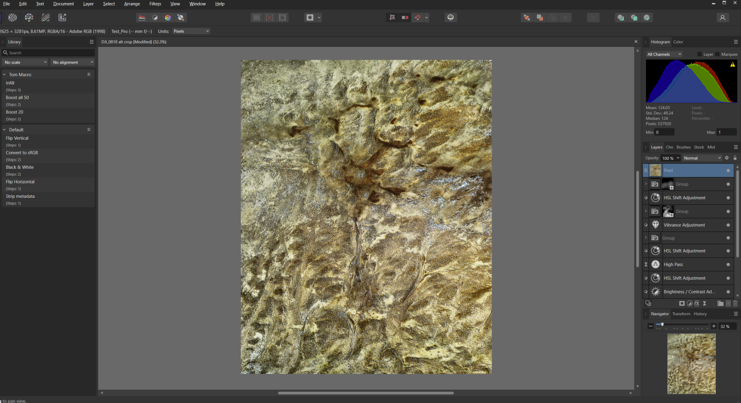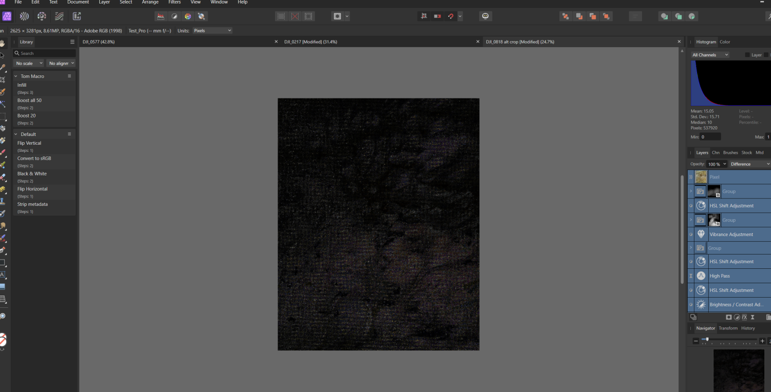 Thanks for the replies. The effect is not due to the high pass filter. I deleted this and still get the same effect. No other high pass filters. The two mask layers are simple mask with normal blend modes. in one there is a curve adjustment and a level adjustment and in the other there is an HSL adjustment. There is another mask layer lower down which has two contrast adjustments - one with a darken blend mode and the other with a lighten one. Deleting all of these groups with mask layer does not resolve the problem. In fact, it is only when I delete all of the adjustment layers that I do not see an effect. There are three pixel layers at the bottom of the stack. The first being the original, the second is a copy of the original with as far as I can remember being the application of the haze filter and the third one being a copy the second with one with a bit of burning and dodging Removing these two pixel layers and only leaving the original one still results in a similar effect when merging. Also, if I export as a Tif file before merging, the tif file looks like the merged layer. Attached is the Affinity photo file for the image. Rather baffled. Hope you can clarify. Thanks and Cheers, Tom PS my connection is very slow tonight and have not been able to upload file. Will try tomorrow.