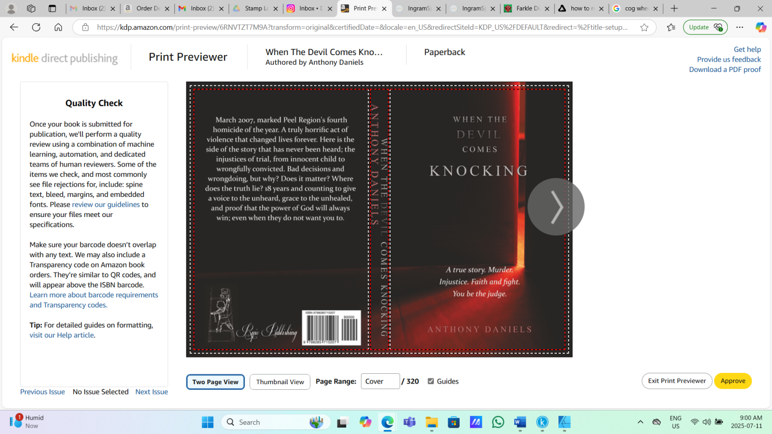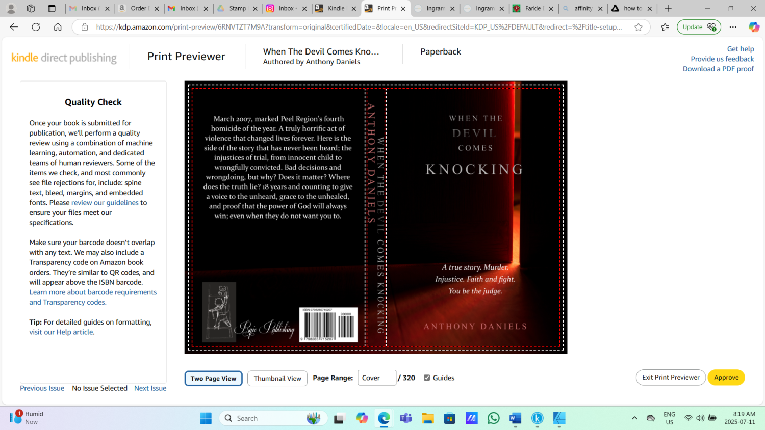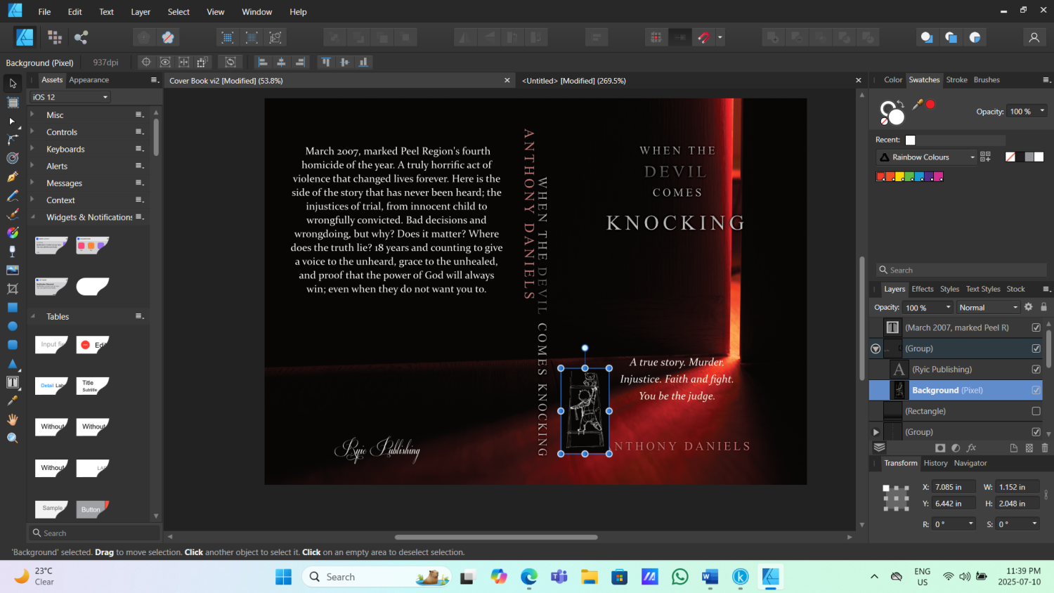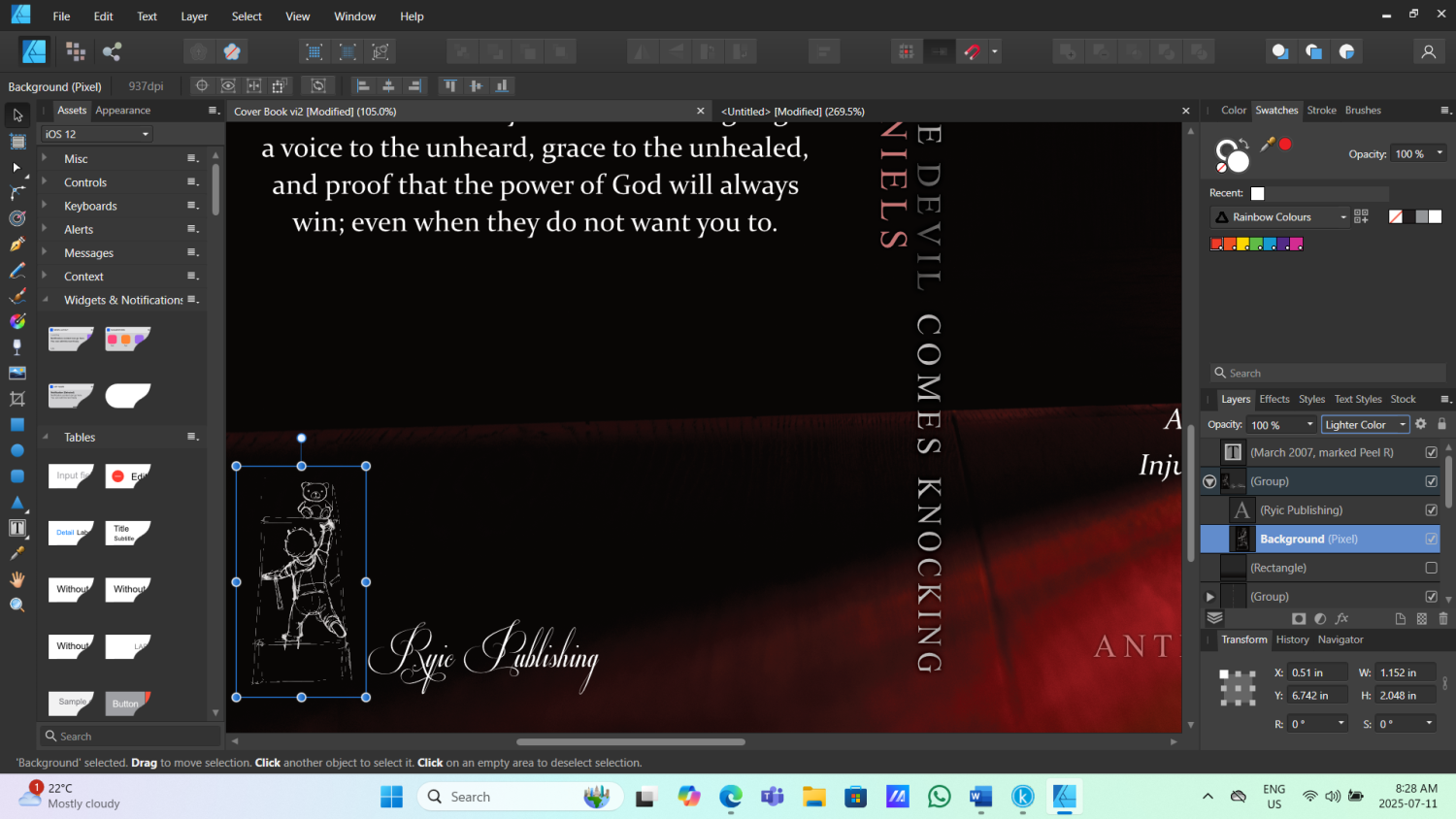 Ok, so the issue I have is that for whatever reason that black background appears as a white shaded area when I upload my cover to amazon. I am guessing this is a layering issue. The problem is, if I flatten the PDF to remove layering I can not maintain the CMYK color profile Amazon abides to. I have ordered copies and fixed that shaded area so its black with the rest of the cover but the design itself is not as prominent and loses its depth on the actual printed cover. I'm trying to get rid of that background and maintain the proper color profile to see if it fixes my issue with my printed book cover. Thank you for the text edit tips!