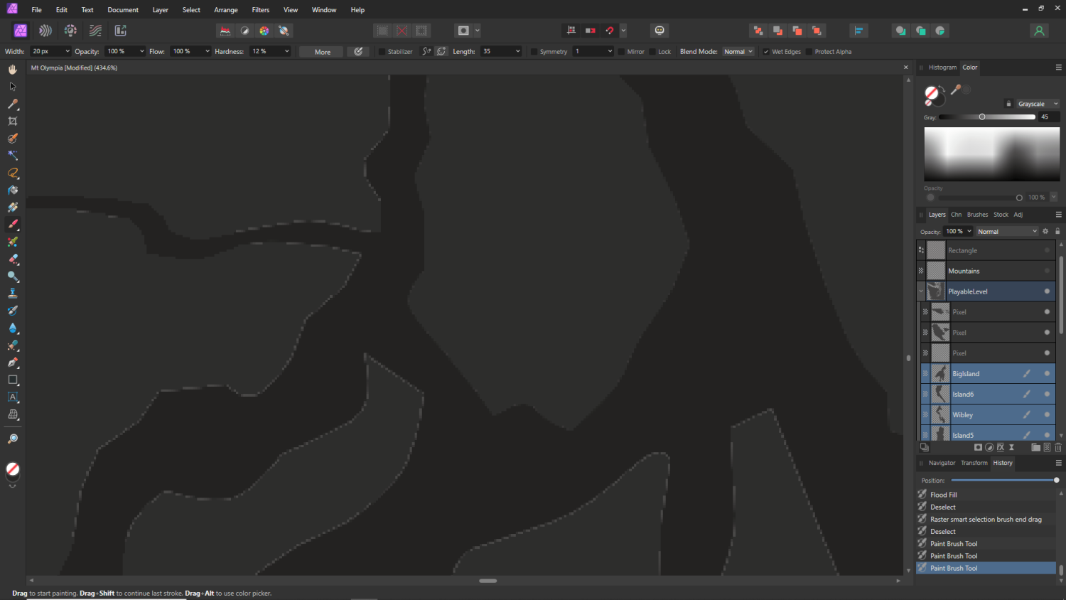 I create grayscale maps a lot for 3D textures and height maps for terrain. I downloaded a grayscale image from google maps via "Google Maps for Height map". After adjusting the black and white values with levels I exported using "grayscale 16bit" My terrain looks like a pixelated mess. (document is 4096 x 4096) When I zoom in within Affinity, I notice a lot of banding with the transitions of gray values. Is this banding causing my terrains to render pixelated or am I missing something working with grayscale in Affinity?