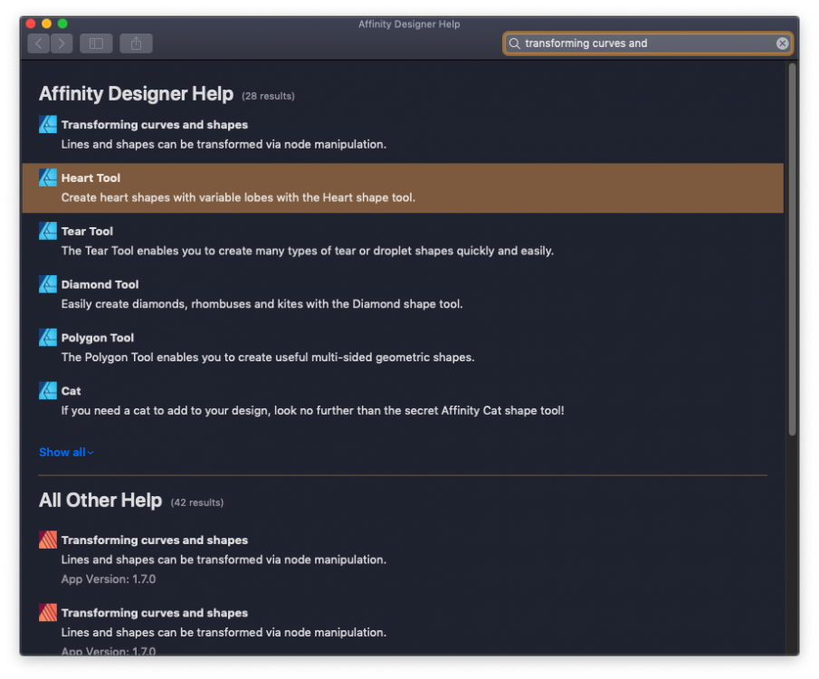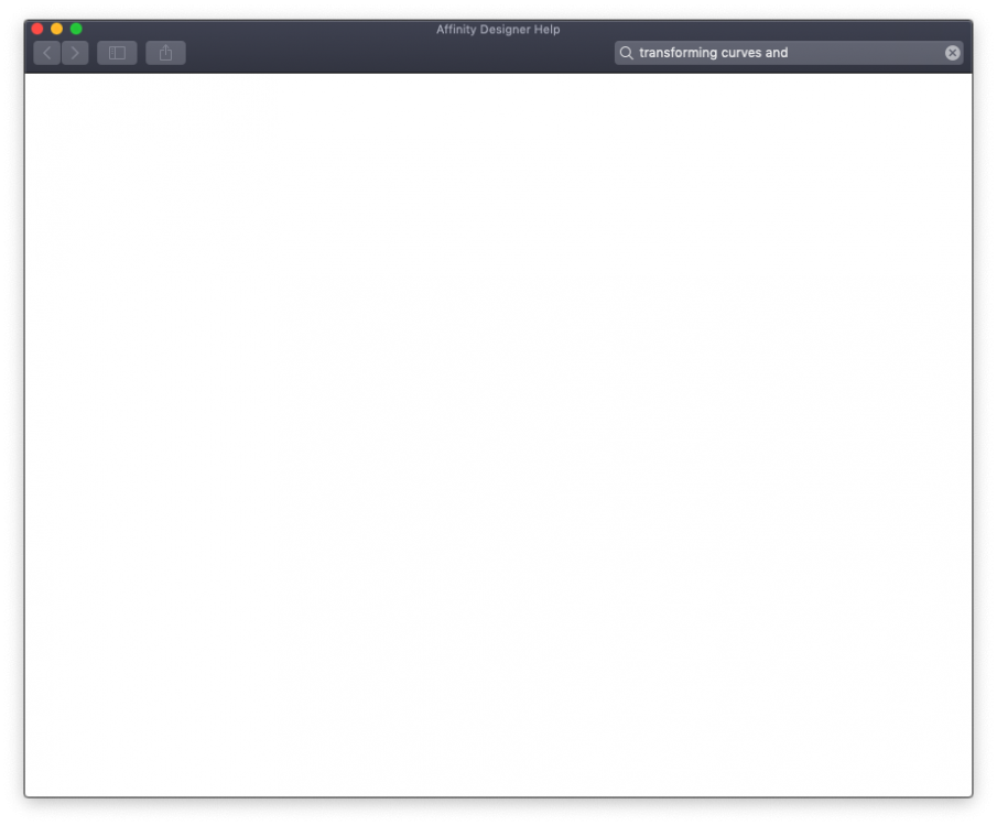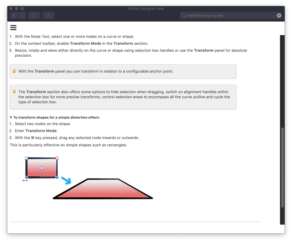 Hi, I have AD 1.6.1 on MacOS Mojave 10.14.3, and when I tried looking up Help on transforming (as I need the one thing missing in the default shapes, a parallelogram) I got.. well, nothing. Is this me or is there something broken here? Is this not-help stored locally or does it have to be pulled in from the Net (in which case it isn't)? First I used the pulldown menu, and I drew a blank after selection of the topic that appeared viable to me. Next I re-entered the search term in that window I got and got something which after a mouse click led me to .. .. nothing again. Don't get me wrong, I like the minimalism but it's just a tad unhelpful. I also have AD beta 1.7.0.4 installed which DID give me an answer after some prodding (screenshot added), so I'm guessing that's what I'll have to use for the moment. Bug, feature or me? (BTW, not to worry about the parallelogram, that turned out to be as stupidly easy as I was suspecting - no need for transformations ) Cheers, Binc