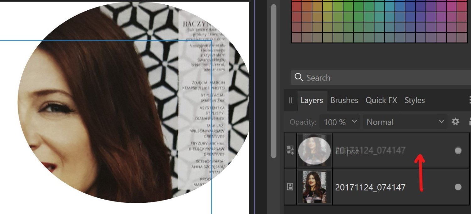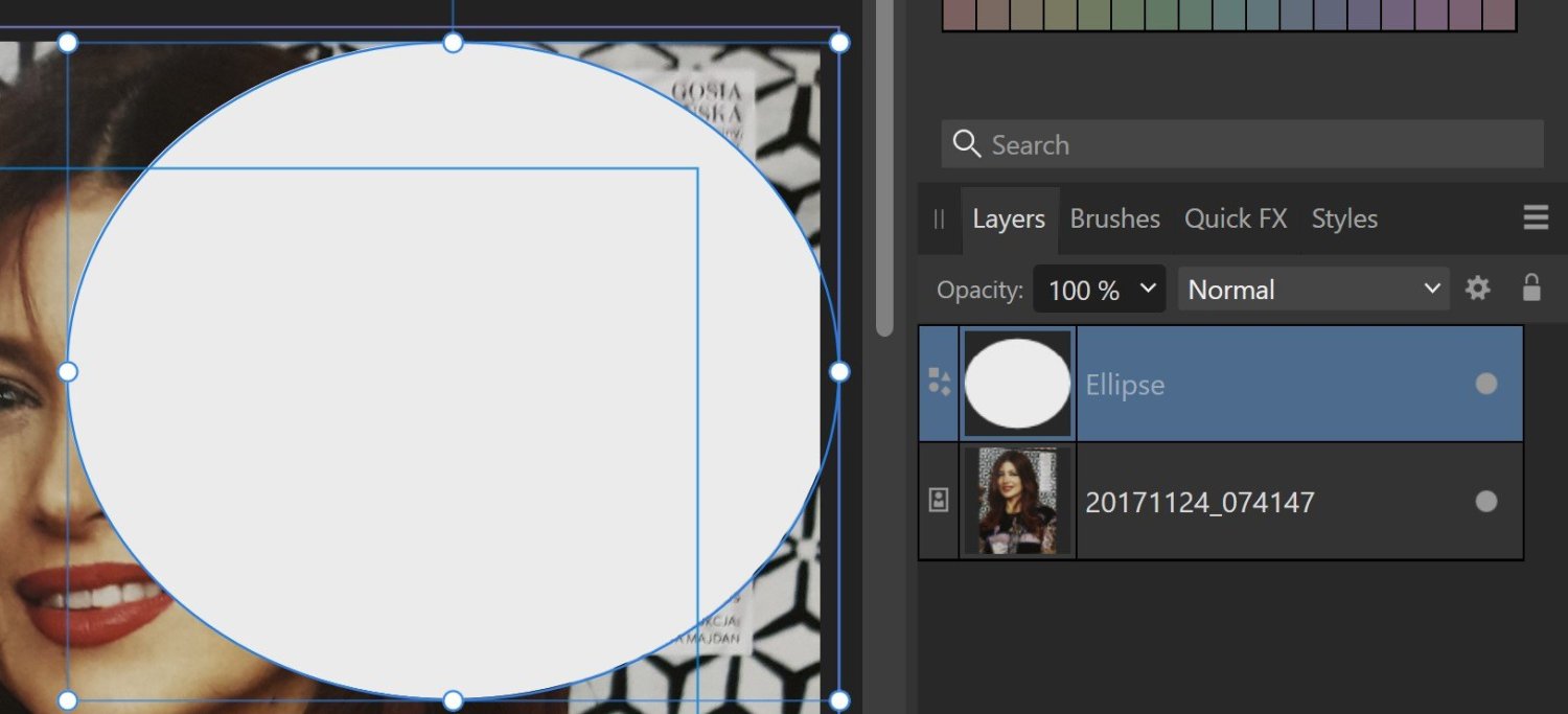 You're doing it wrong. Intersect applies to vector objects. And you want to mask the image (jpg). You can do this from the layer palette or from the layer menu. From the layer palette Select an ellipse in the layer palette and right-click. (See mask 1.jpg) From the context menu, select mask to below. (See mask 2.jpg) As a result, you will get (see mask 3.jpg) From the layer menu Select an ellipse in the layer palette. Go to the top menu Layer click and select Mask to Below (it is at the bottom of the menu). My favorite method is: in the layer palette, press hold the layer with the photo with the left mouse button and drag it to the name of the top layer (ellipse) when you see that it is already inside the ellipse - release the left mouse button. (See mask4.jpg) That's it