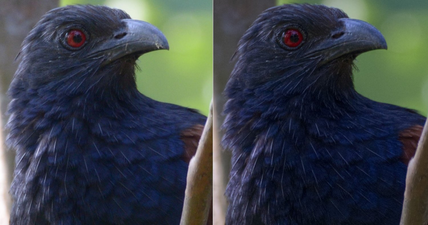 Here is another screen shot of 100% or 1:1 pixel on screen. The left image is original and right image is sharpened with above method. Before sharpening , mild colour and contrast improvement was done in LAB mode. Sharpening done last, in RGB. The background is masked out from the sharpened layer using a mask that is white for the bird. So only the bird appears sharpened. So no unwanted noise or grains in the background green unfocused area. D7000/ sigma 150-600 C, 1/320 sec / 1000 ISO, 600mm , handheld.