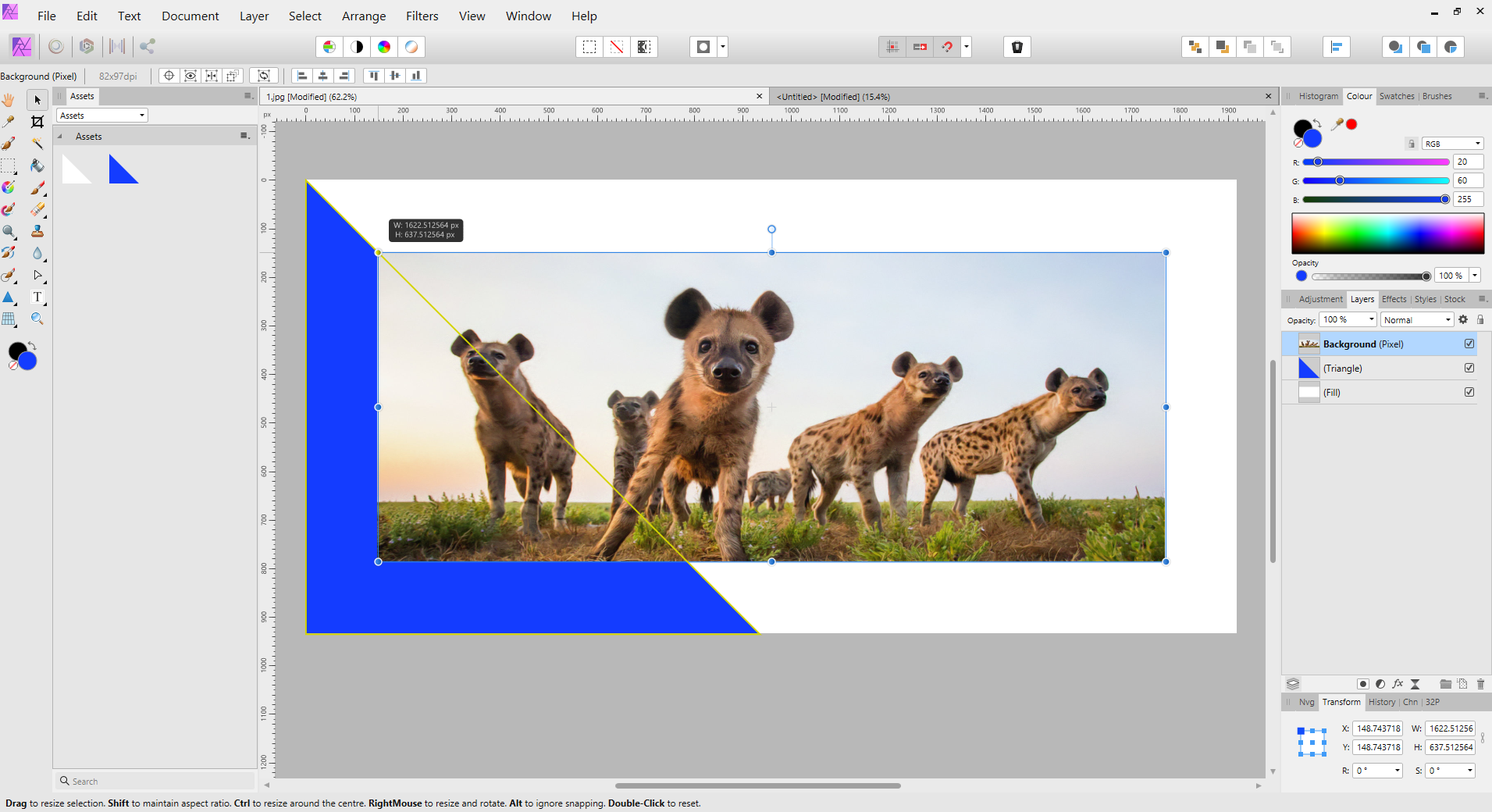 carl123 Posted December 25, 2020 Posted December 25, 2020 After adding your fill layer at the bottom of the stack Add a triangle above it which has the same width as its height (Shown in blue below just so you can see it but same colour of the background is fine.) Now grab the top-left handle of your image layer and whilst holding the ctrl key down, drag diagonally along the long edge of the triangle (Also known as the hypotenuse for those that remember their school days). Assuming you have the correct snapping options set, the left-hand handle will snap to the hypotenuse. Wherever it snaps you will have equal space all around your image If you do this a lot you can save the triangle to your Assets and just drag it onto your document whenever you need it For portrait orientated images it's the same procedure except a different position for the triangle and you drag a different handle firstdefence, Alfred and SAW 2 1 To save time I am currently using an automated AI to reply to some posts on this forum. If any of "my" posts are wrong or appear to be total b*ll*cks they are the ones generated by the AI. If correct they were probably mine. I apologise for any mistakes made by my AI - I'm sure it will improve with time.