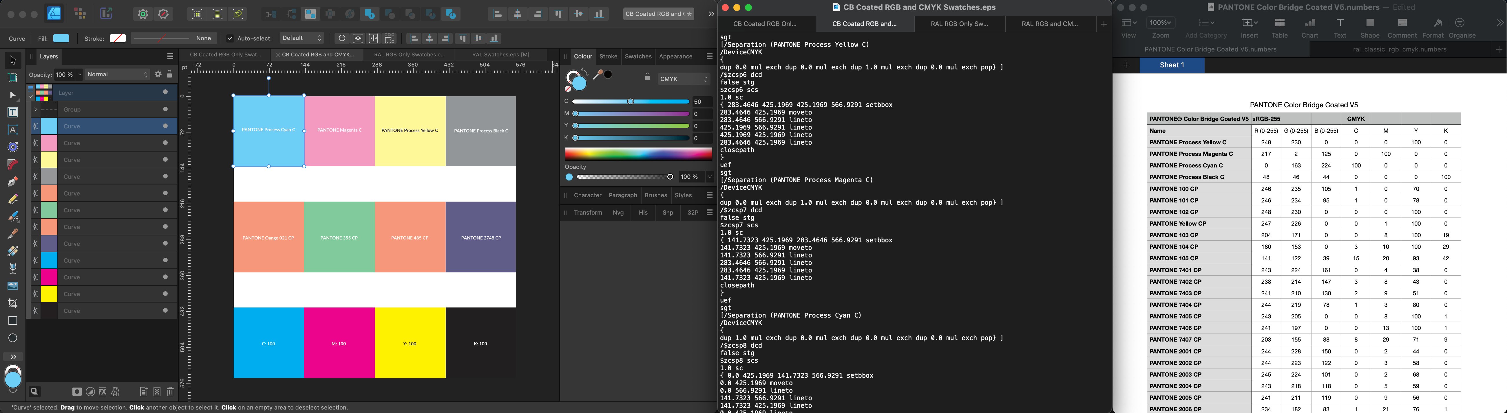 Hangman Posted June 12, 2023 Posted June 12, 2023 Hi @Dan C, I was unsure whether to raise this as a new thread or continue an older, potentially related thread, but decided to start a new thread because I now have, what appears to be a repeatable formula to reproduce the issue and so have linked the other two, possibly related, threads at the end of this post should they all need to be merged. The CSV Pantone libraries used by the Affinity apps are defined using either sRGB only or sRGB and CMYK colour values, i.e., these palettes combine sRGB and CMYK colour references in the same palette... PANTONE Color Bridge Coated V5.csv PANTONE Color Bridge Uncoated V5.csv PANTONE GoeBridge Coated.csv PANTONE Plus CMYK Coated.csv PANTONE Plus CMYK Uncoated.csv The remaining palettes use sRGB colour references only... There is a bug in the macOS version of the Affinity apps (appearing in a couple of different posts), logged as AFD-6216, where EPS files created in third-party apps, in certain circumstances, display CMYK values of 50% and above as exactly 50% when opened in Affinity apps. A few instances of this issue have involved EPS files created in Illustrator, though I've now created files in VectorStyler demonstrating the same exact issue. Note 1: I don't believe the issue itself is either an Illustrator or Vectorstyler problem and it is likely possible to create using any third-party vector software following the same process. Note 2: The EPS files open correctly in V1 of the Affinity Apps but incorrectly in V2. Note 3: EPS files created directly in Affinity Apps, using the same colour palettes do not demonstrate the issue when the exported EPS file is opened in either Affinity or third-party apps. As far as I'm aware the issue is Mac-specific and to date, I don't think there's been a specific formula to recreate the problem but some additional testing seems to suggest the following... Third-party apps generating CMYK EPS files using colour palettes defined using combined sRGB and CMYK colour values, result in DeviceCMYK colour definitions while those using sRGB only colour values in the colour palette result in DeviceRGB colour definitions in the exported EPS file, while in both cases, the colour is defined using CMYK values in Affinity apps. It appears that in V2 of the Affinity apps, any EPS file that uses DeviceCMYK as its colour definition incorrectly interprets CMYK values above 50%, regardless of the value between 50% and 100% and subsequently displays those values at exactly 50%. In the V1 Affinity apps, the same file is correctly interpreted. Testing this with any palette that combines sRGB and CMYK values in the same colour palette (whether an ASE, CSV, XML or JSON third-party palette), produces the same incorrect CMYK values in Affinity 2 apps. Device CMYK.mp4 When looking at both the DeviceRGB and DeviceCMYK colour values in the EPS files themselves, they are shown correctly and perfectly match the values shown in the respective palettes. Affinity Designer v1 - sRGB only Defined Colour Palette - DeviceRGB Colours Correctly Displayed Affinity Designer v2 - sRGB only Defined Colour Palette - DeviceRGB Colours Correctly Displayed Affinity Designer v1 - sRGB and CMYK Defined Colour Palette - DeviceCMYK Colours Correctly Displayed Affinity Designer v2 - sRGB and CMYK Defined Colour Palette - DeviceCMYK Colours Incorrectly Displayed Affinity Designer v1 - sRGB and CMYK Defined Colour Palette - DeviceCMYK Colours Correctly Displayed Affinity Designer v2 - sRGB and CMYK Defined Colour Palette - DeviceCMYK Colours Incorrectly Displayed Links to Two Other Posts Demonstrating Similar Issues Interestingly, the Illustrator files uploaded in both posts are missing their EPS Hex Signature but reinstating the correct signature makes no difference to how the same files appear when opened in V1 vs V2. Logo Italian Embassy CD Artwork Sample EPS Files CB Coated LAB Swatches.eps CB Coated RGB and CMYK Swatches.eps RAL RGB Only Swatches.eps RAL RGB and CMYK Swatches.eps Boldlinedesign 1 Affinity Designer 2.6.3 | Affinity Photo 2.6.3 | Affinity Publisher 2.6.3 MacBook Pro M3 Max, 36 GB Unified Memory, macOS Sonoma 14.6.1, Magic Mouse HP ENVY x360, 8 GB RAM, AMD Ryzen 5 2500U, Windows 10 Home, Logitech Mouse