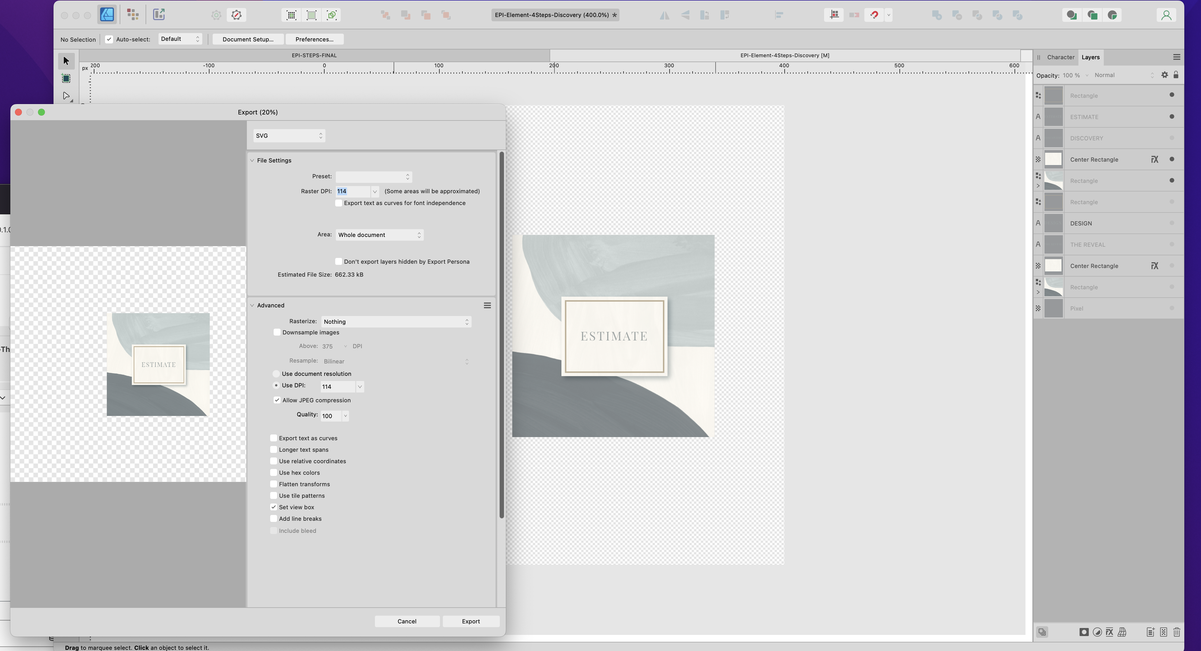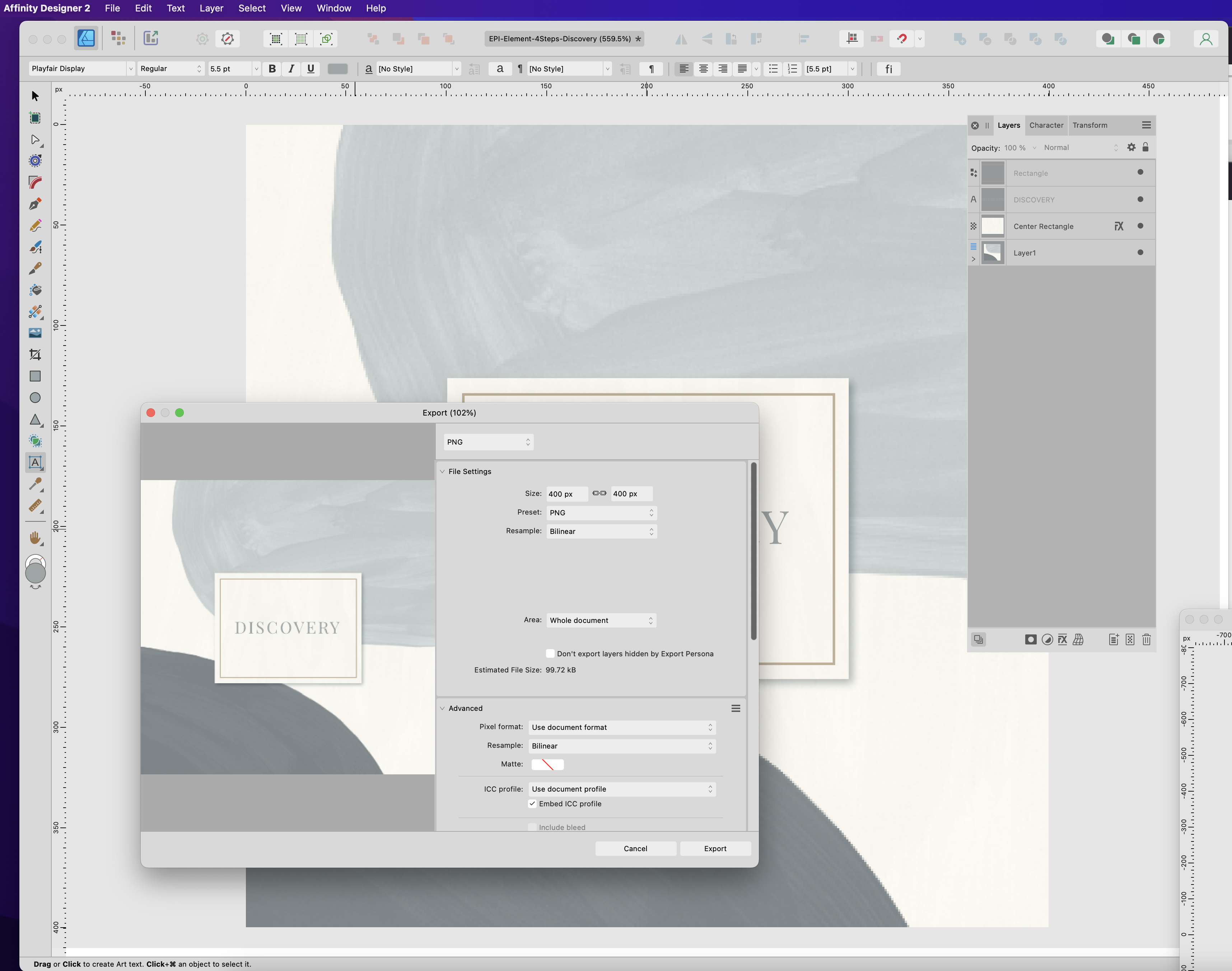 affuser9001 Posted August 1, 2023 Posted August 1, 2023 Hi, Affinity Designer V2.1.1 • macOS Monterey V 12.6.7 Accelerated Hardware is checked in Preferences. Designing a 700 x 700 px, 300 dpi with image and text. Exported as png at full size. Noticed that when uploaded to website, the font/text is blurry. Edited original doc and Rasterized the font layer, exported once more to png, the font is still blurry. See images: The Rasterized Layer within the original document is blurry. The text layer is clear. Any tips to fix?
