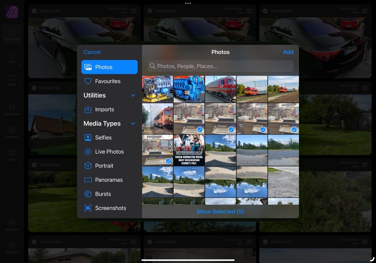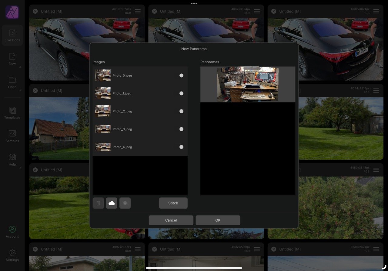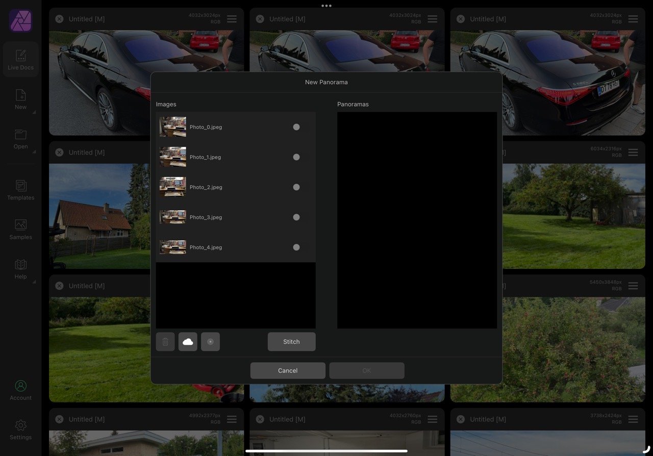 Sz_Andras Posted August 18, 2023 Author Posted August 18, 2023 4 hours ago, Lee_T said: Hi Sz_Andras, when browsing for the files to select for your panorama, these will be unchecked by default. This is common sense as a folder could potentially have thousands of files, and unchecking the ones selected would be far more work than adding the ones selected. Once the files are selected, in the panorama window, these are selected by default and can be manually disabled. Lee may be I expessed myself in an uncler way. I know how te select the images to create the panorama. When the selected images are added to the panorama window I have to check these images one by one, - see the attached screenshots - while in the Windows version all added files are checked by default to stitch the panorama. BTW I noticed an other problem - I tried to cancel the ready stitched image, Affinity Photo for iPadOS crashed.